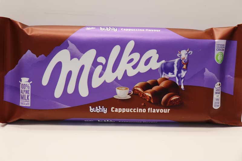 A creamy milk‑chocolate bar made with Milka’s Alpine milk, featuring a light, airy (“bubbly”) texture and a smooth cappuccino‑flavoured filling.